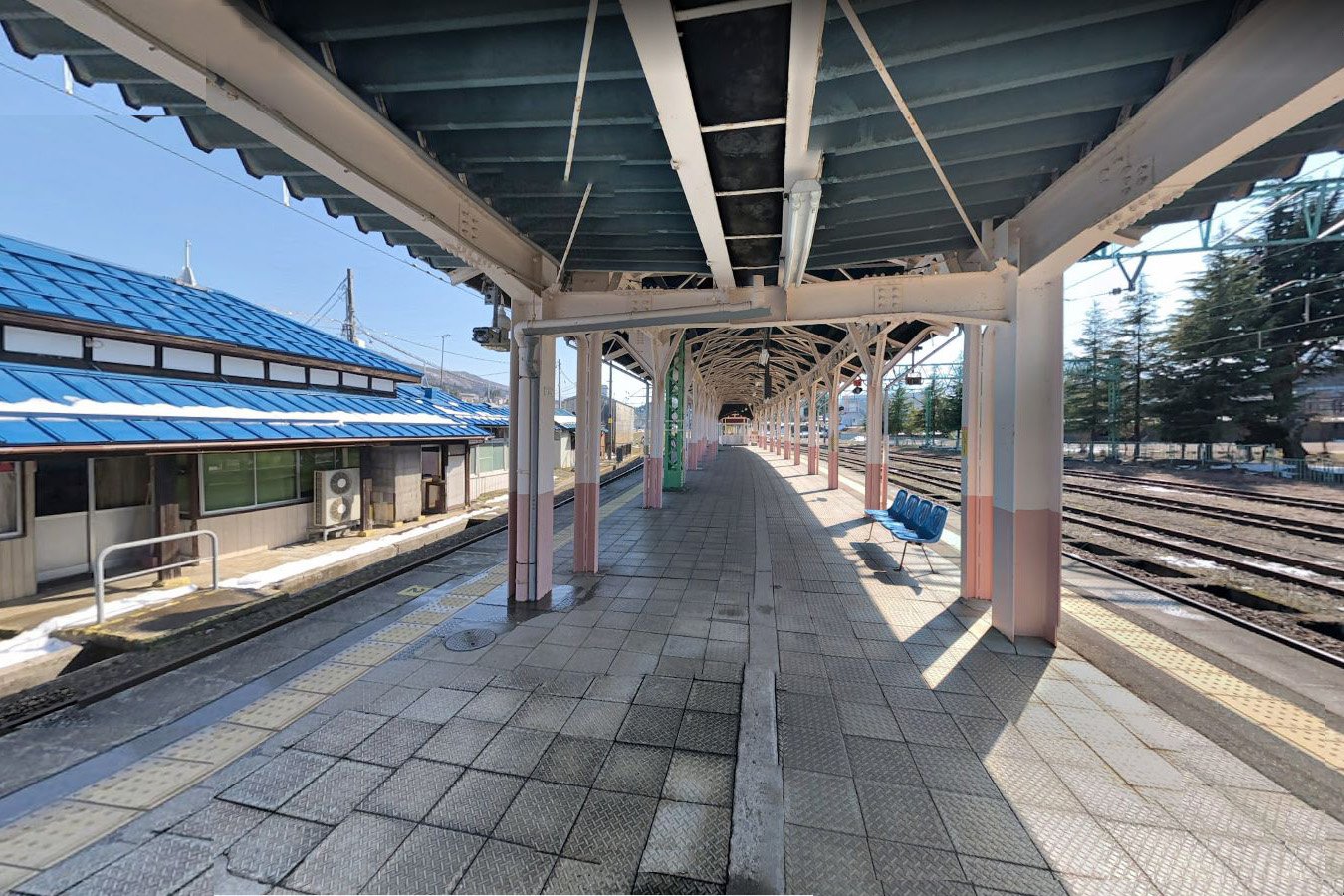 駅舎とホームを繋ぐコンクリート造りの地下通路は、1941年(昭和16年)から1942(昭和17年)かけて造られたものであり、戦前で地方で造られたものとしては珍しい。また、長野寄りの引込線を覆う木造の「雪囲い」は1911年(大正11年)に建築されたもので、明治時代のレールを柱として再利用し、壁や屋根を木の板で構築しています。