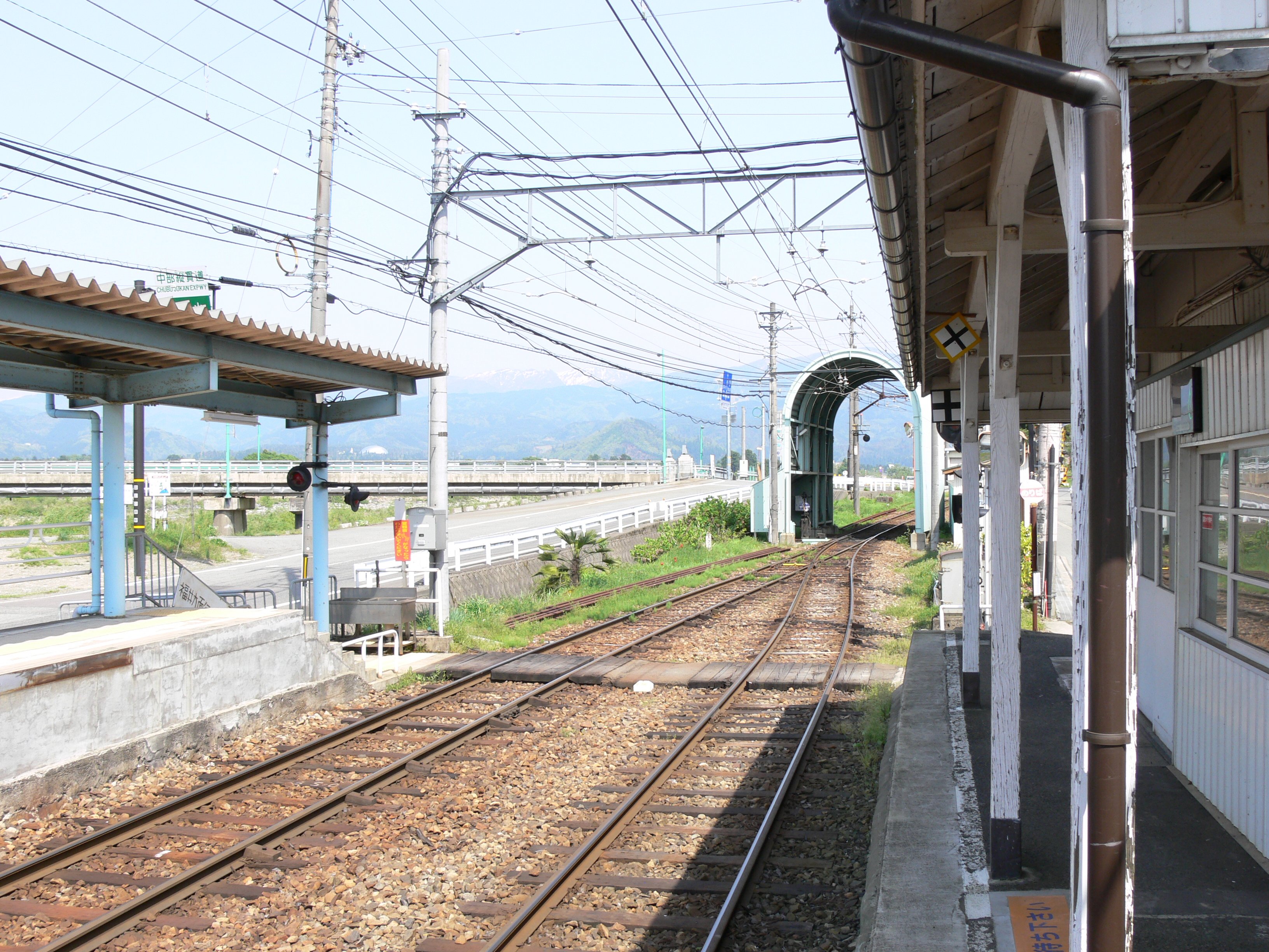 木造の駅舎は本線南側の福井方面ホームに隣接し、屋根の一部をホーム上屋としている。