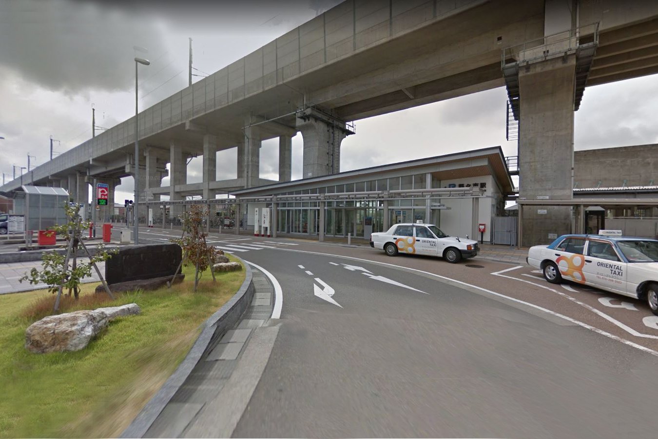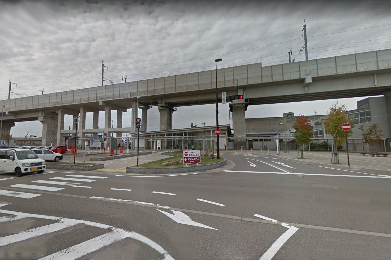 北陸新幹線(金沢駅以西の開業までは金沢駅 - 白山総合車両所の回送線となる)が南口駅舎の上を通過するため、南口周辺の再整備が行われたが、隣接する西金沢駅や松任駅のように橋上化は行わず新たな地上駅舎が建設され、2012年4月21日の始発より使用を開始しました。2010年9月4日の始発より2012年4月20日の終電までは仮駅舎が使用されていました。