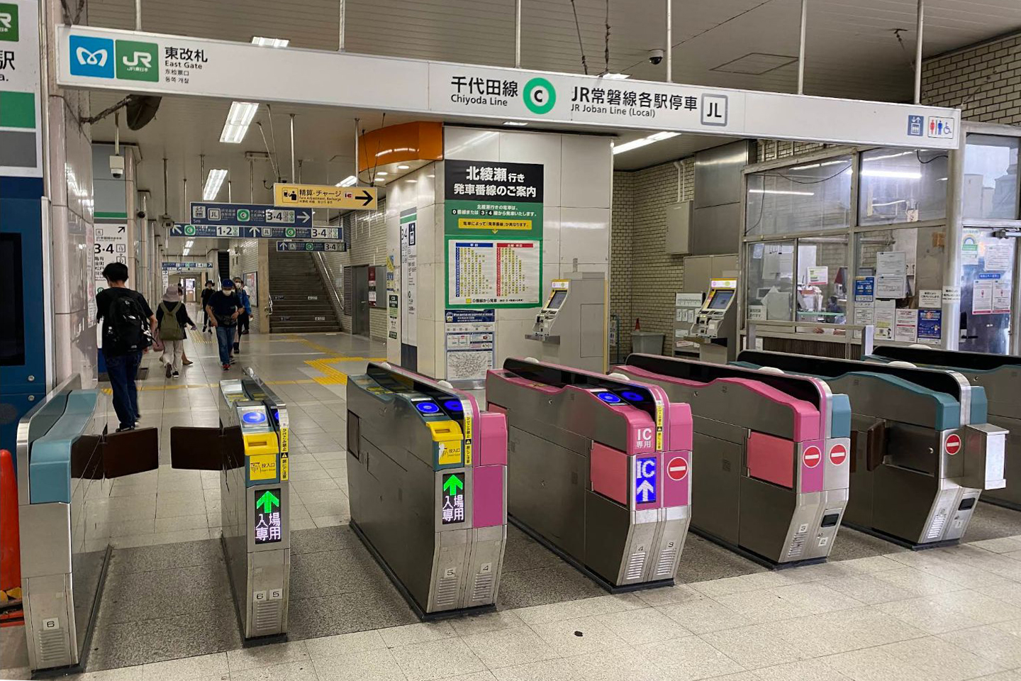 - 三河島・日暮里方面へは、1・2番線(一部3番線)の列車を利用の上、北千住で乗り換え。この場合、当駅 - 北千住間も運賃計算上JR線扱いとなる。なお、2006年(平成18年)秋に案内表示を更新する前までは「三河島方面へおいでの方は、北千住でのりかえです」という赤文字の案内事項が記載されていた。