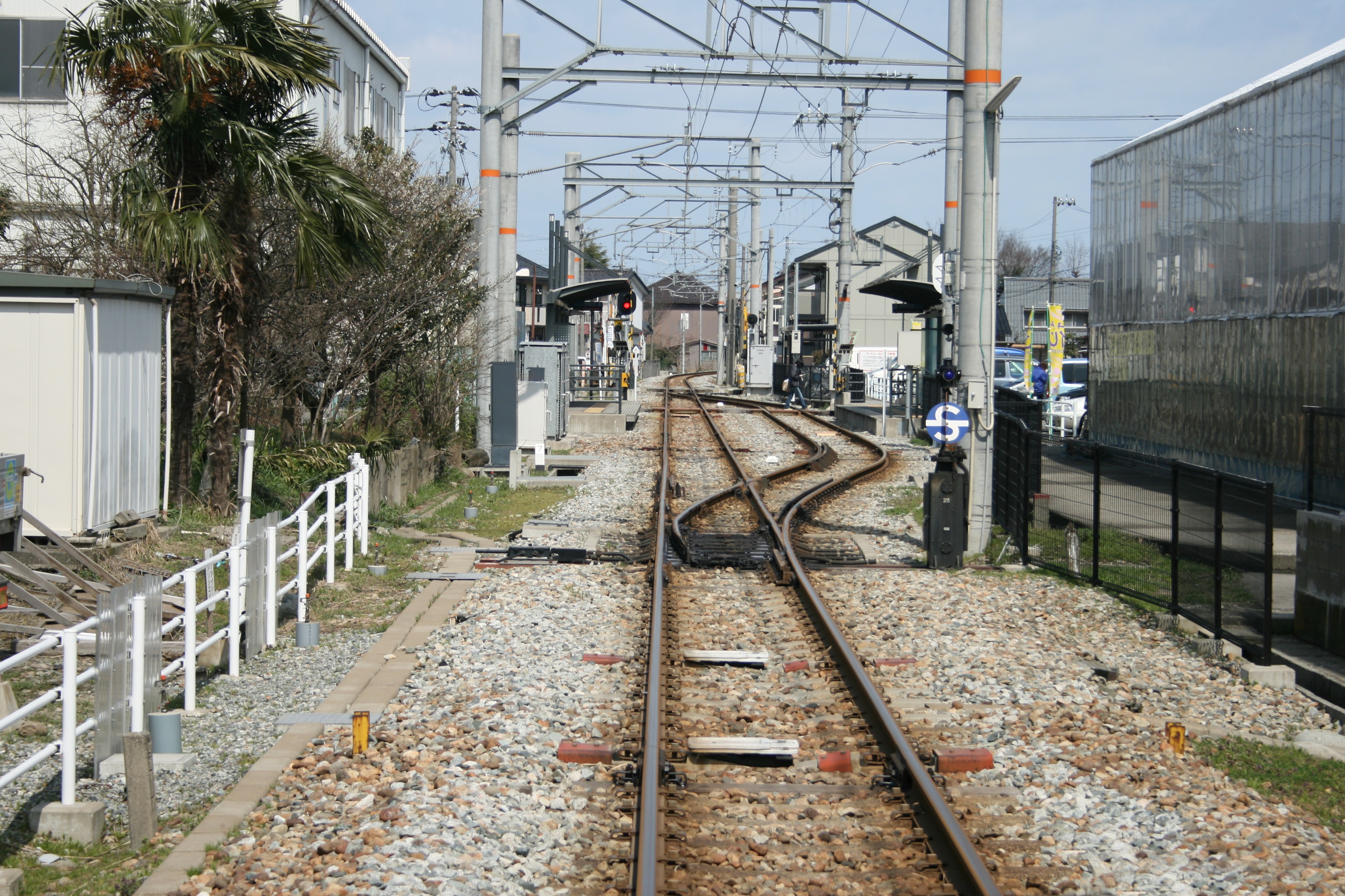 当駅北側には曲線区間があり、上り列車が構内に進入する際の見通しが良くないため、上り用の場内信号機の手前には、当線では唯一の遠方信号機が設置されています。(いわゆる予告信号機ですね)