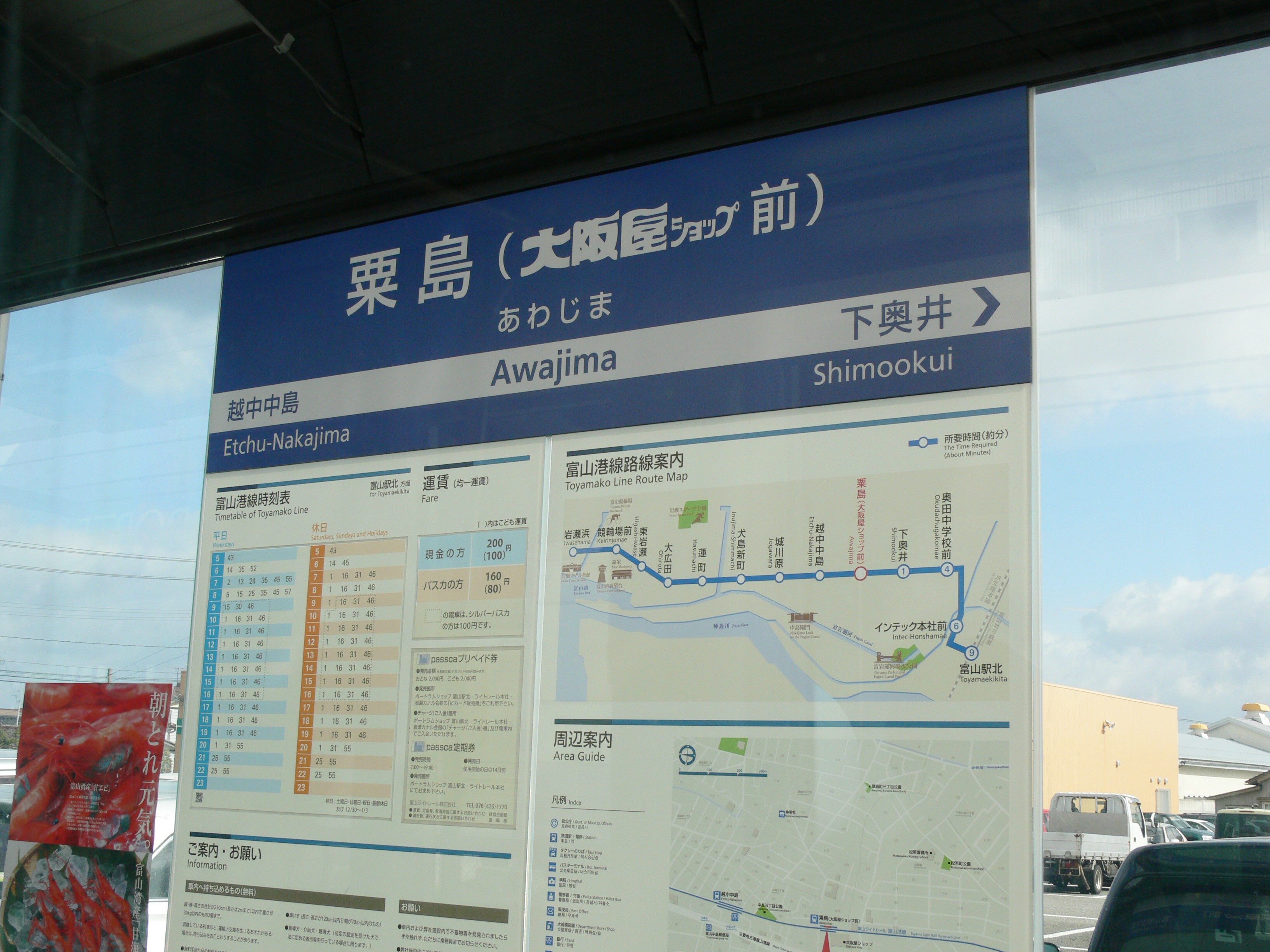 富山ライトレールは駅名について当初「正式名称を粟島駅とし、粟島(大阪屋ショップ前)駅は利用者向けの名称として用いる」と発表していました。しかし開業初年度の『鉄道要覧』(2006年度版)の掲載路線図には括弧付きの「粟島(大阪屋ショップ前)駅」と記載され、実際には括弧付きの駅名表記が広く用いられています。