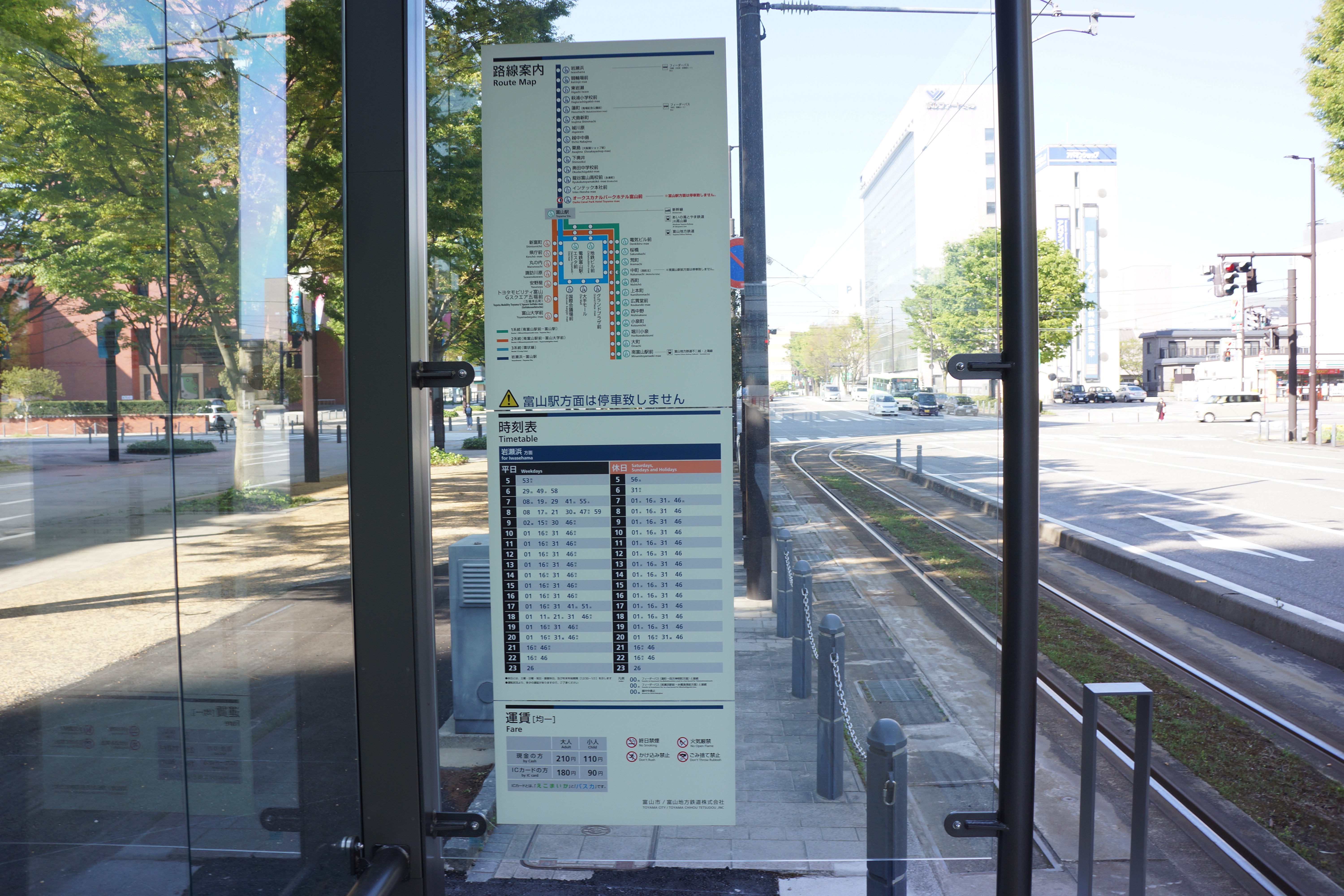 逆方向の富山駅方面は進行方向左側が車道にあたり、ホームや安全地帯が設けられていないため停車しません。