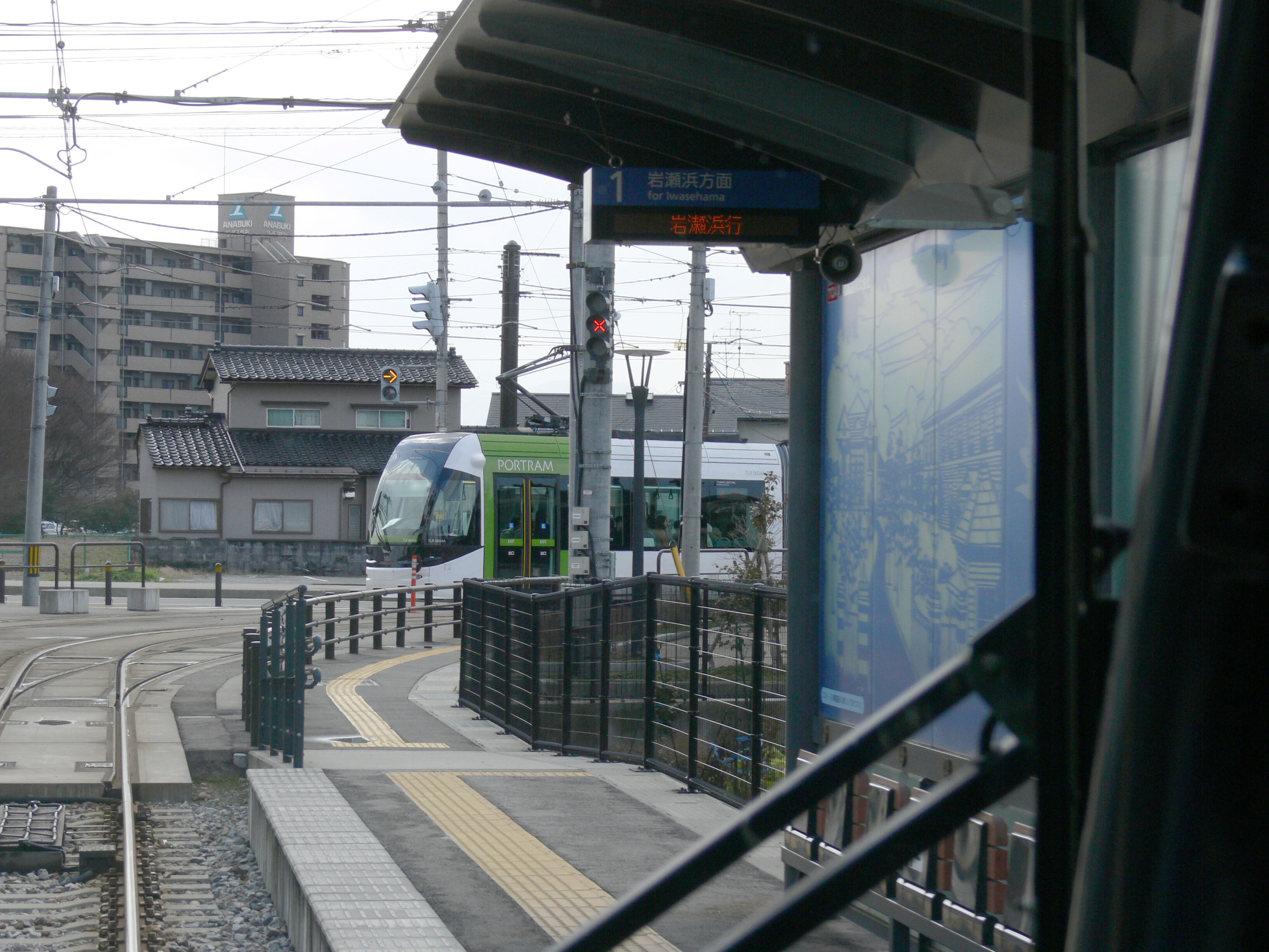 奥田中学校前駅を発車するポートラム |
