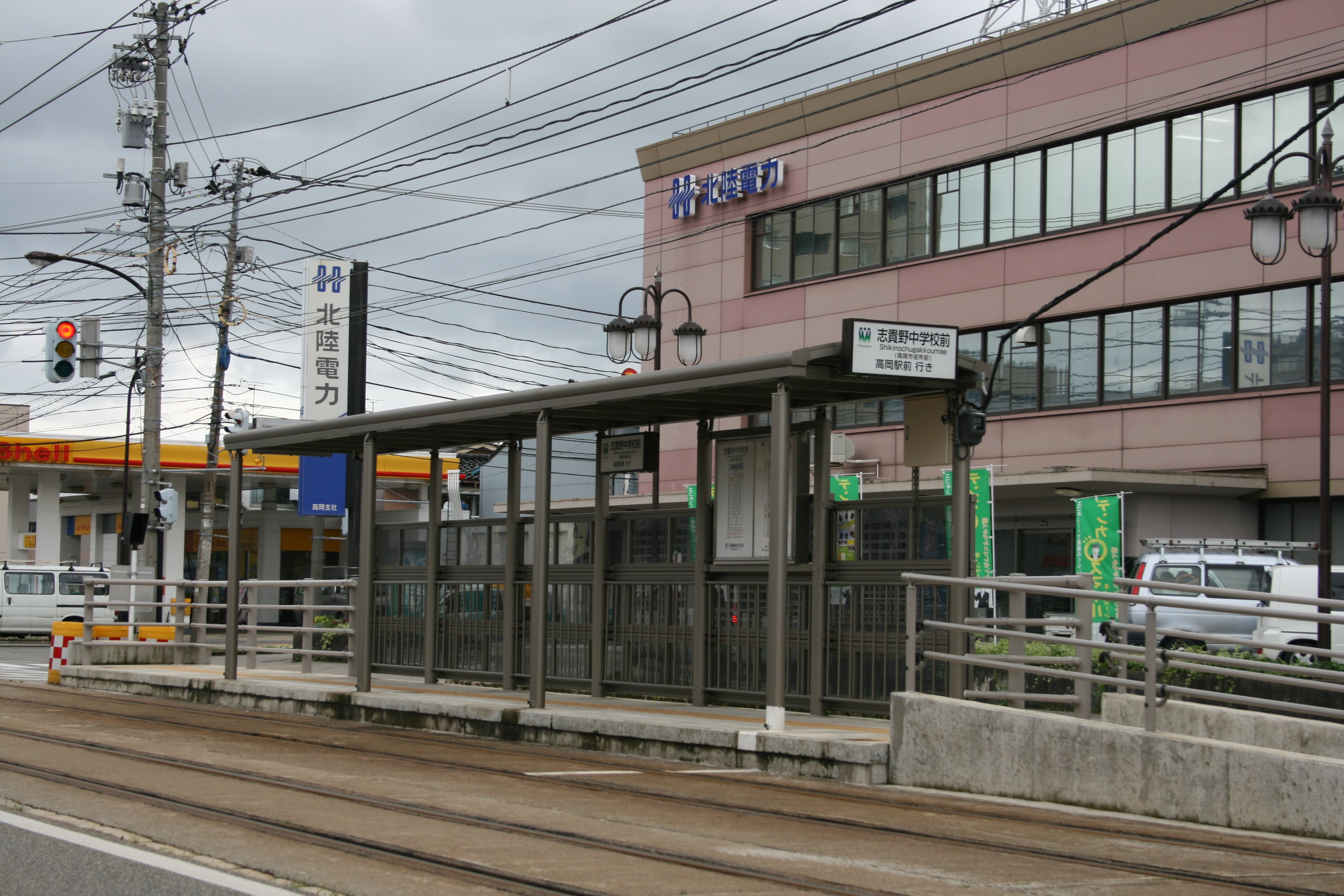 | 志貴野中学校前停留場(しきのちゅうがっこうまえていりゅうじょう)は、富山県高岡市あわら町・広小路にある万葉線の停留場です。高岡市役所の最寄り駅であり、高岡市役所前という副駅名があります。