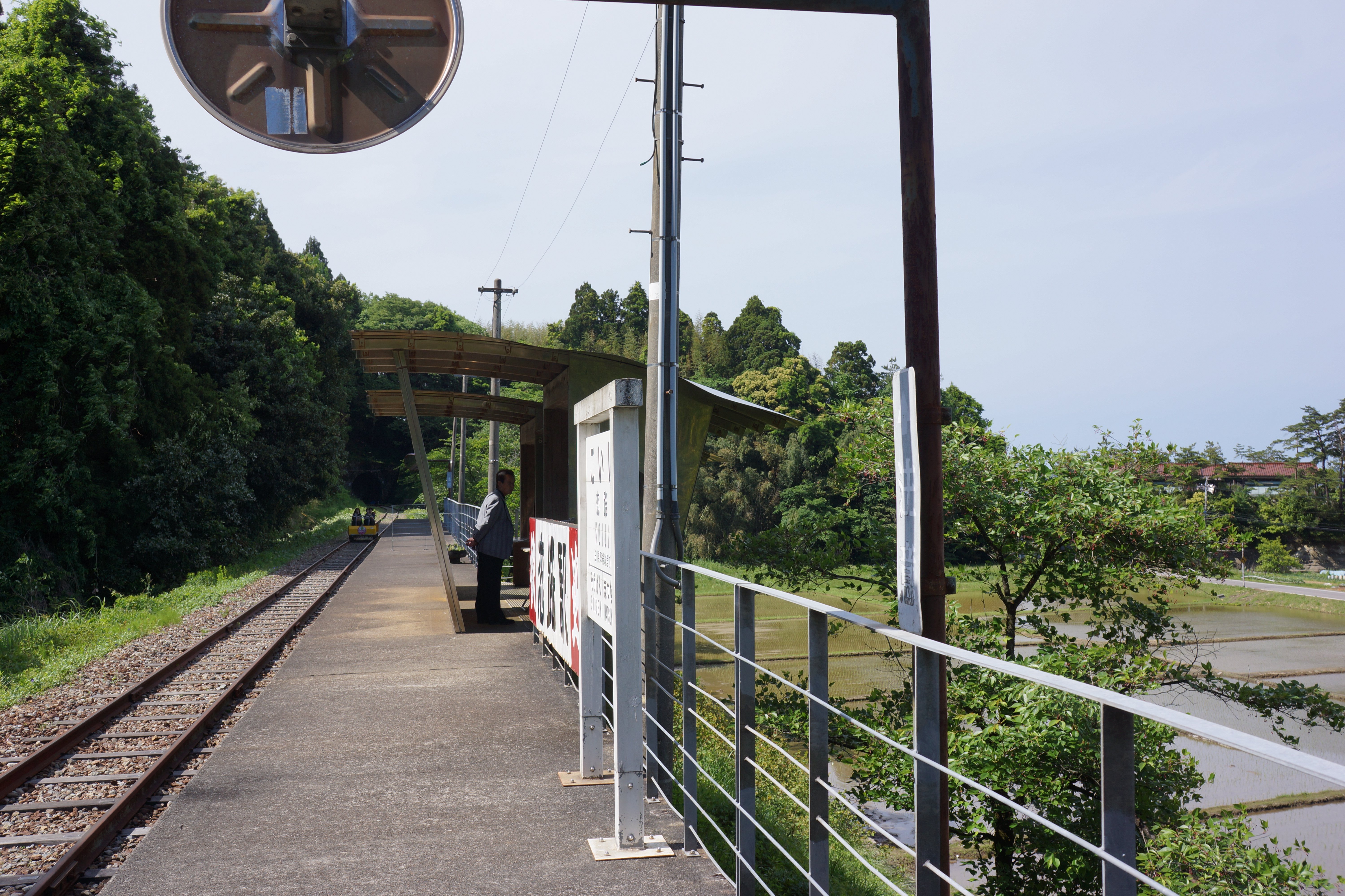 ホームの向こうからトロッコが来ました ホーム上に待合所があります
