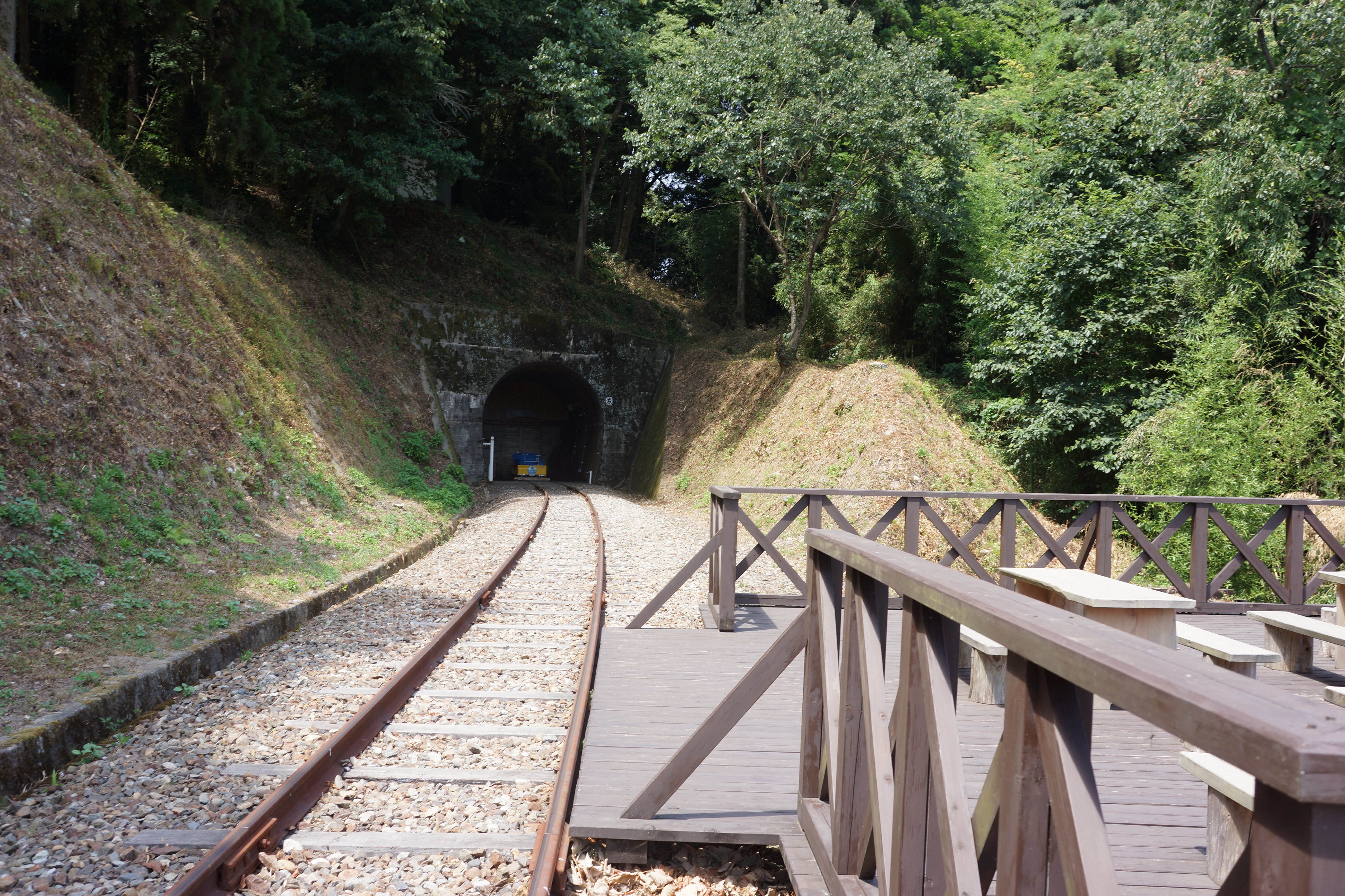 さて、宗玄トンネルの手前に停留所があり、ここで停車します。ここは休憩所になっていますが、とりあえずトロッコを降りて、反対側に乗り込み前述するように中央部のレバーを切り替えます。