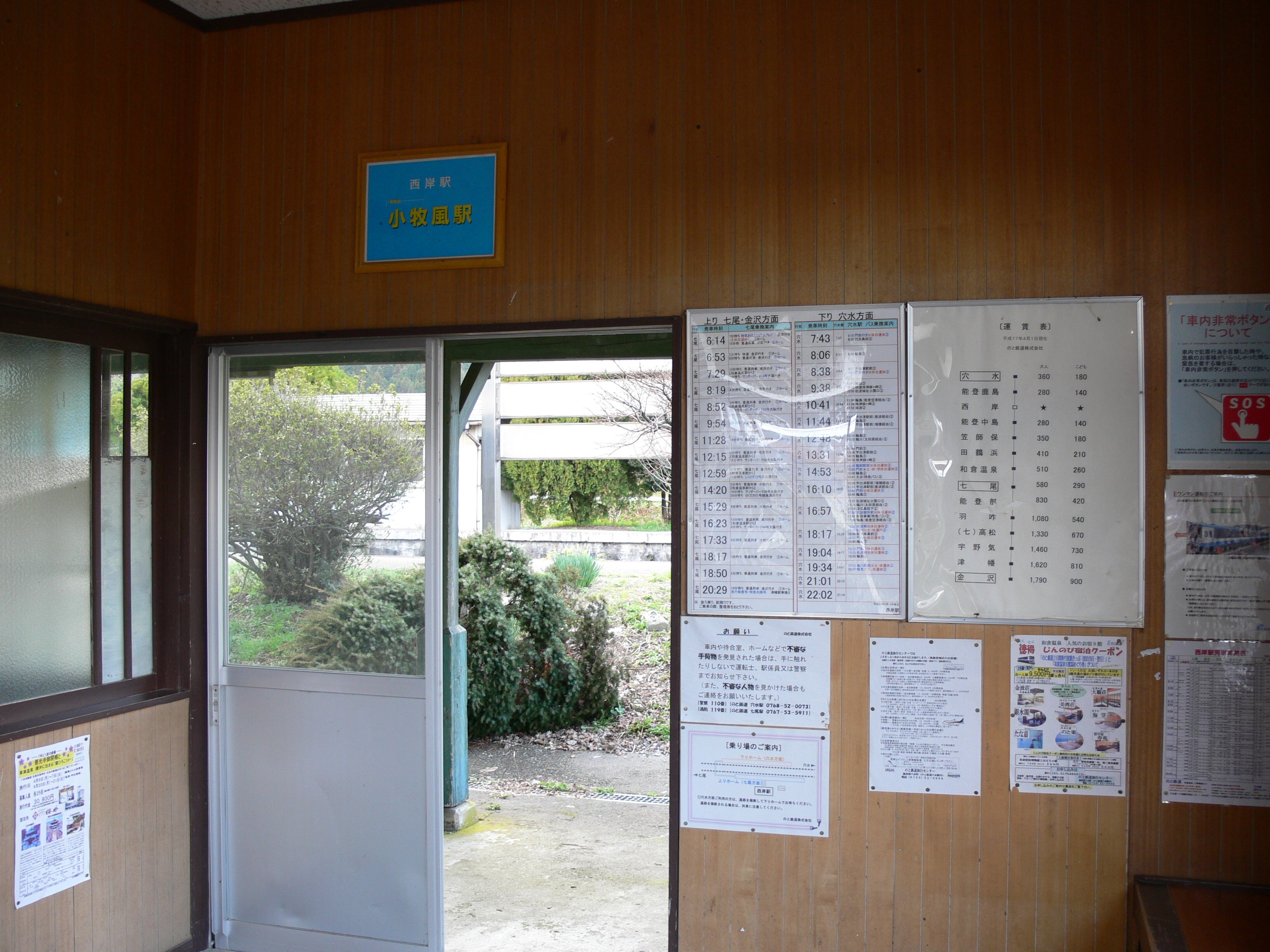 駅舎内には、駅を訪れたファンによる寄贈品や駅ノートを兼ねた聖地巡礼ノートが設置されており、『花咲くいろは』関連のポスター類が貼られている。 |