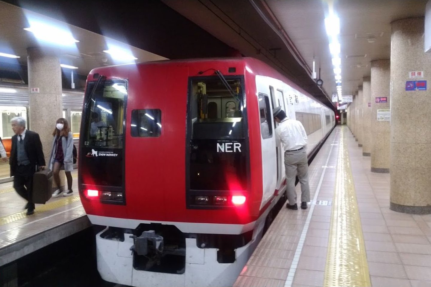 長野電鉄の駅はJR長野駅善光寺口側地下にあり、エスカレーター、階段、エレベーターを用いて下る必要があります。