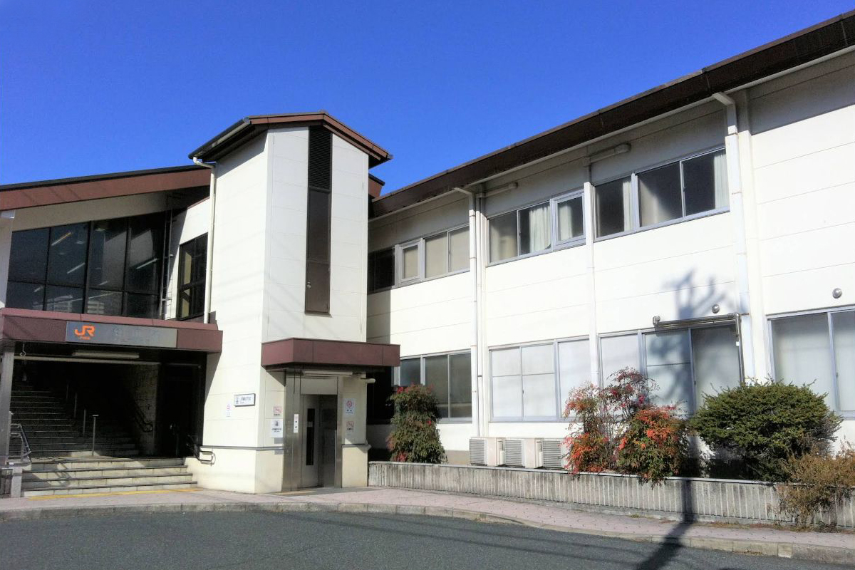 構内の西側にある駅舎は2階建てで、駅事務室・改札口は2階にある。