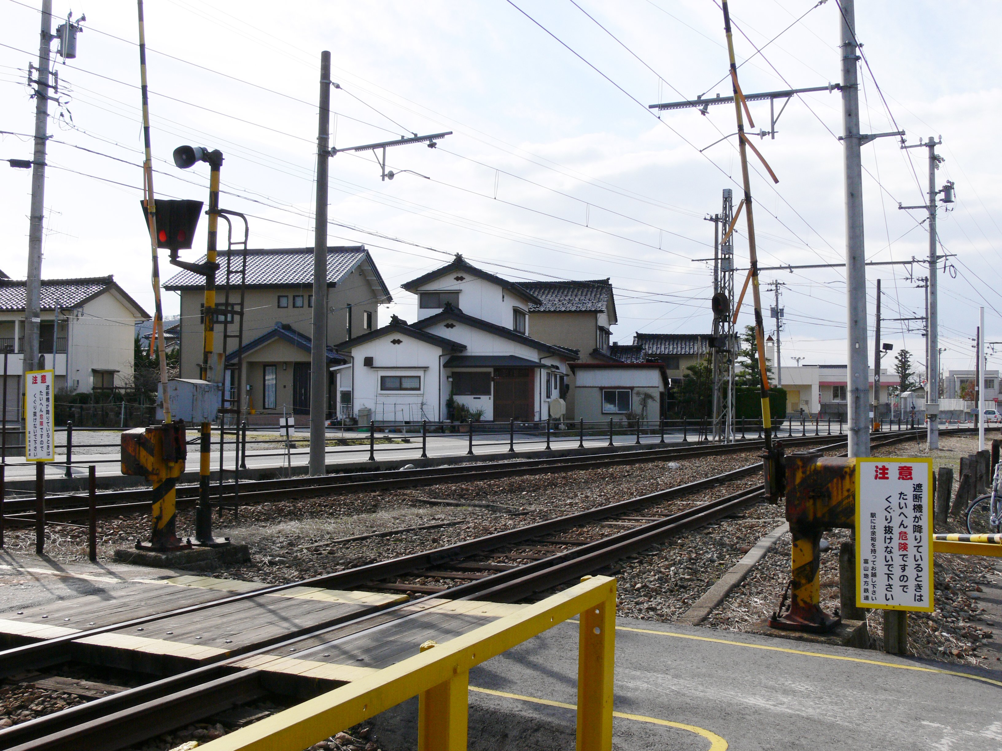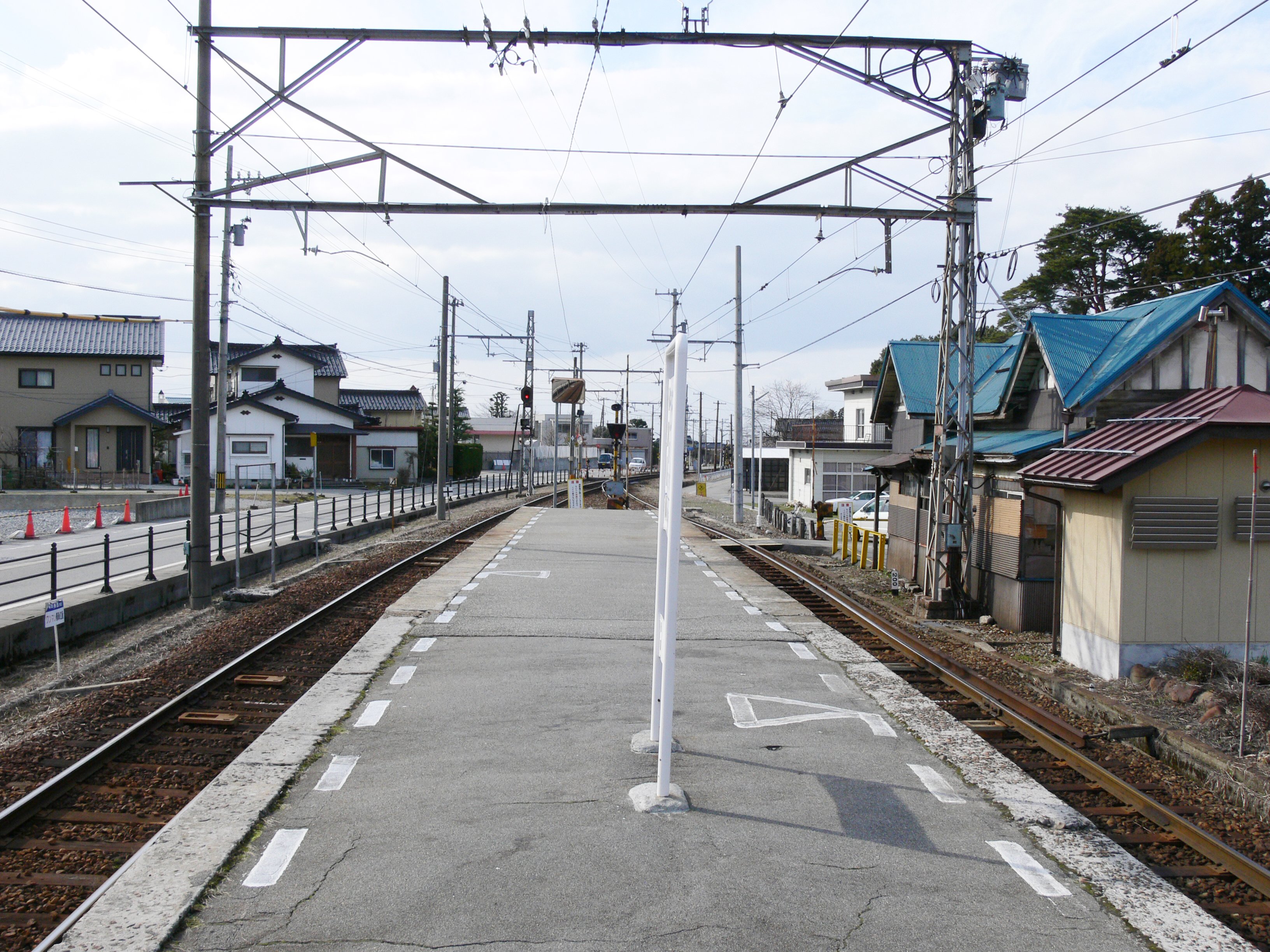 跨線橋はなく、駅舎からホームへは構内踏切を利用します。