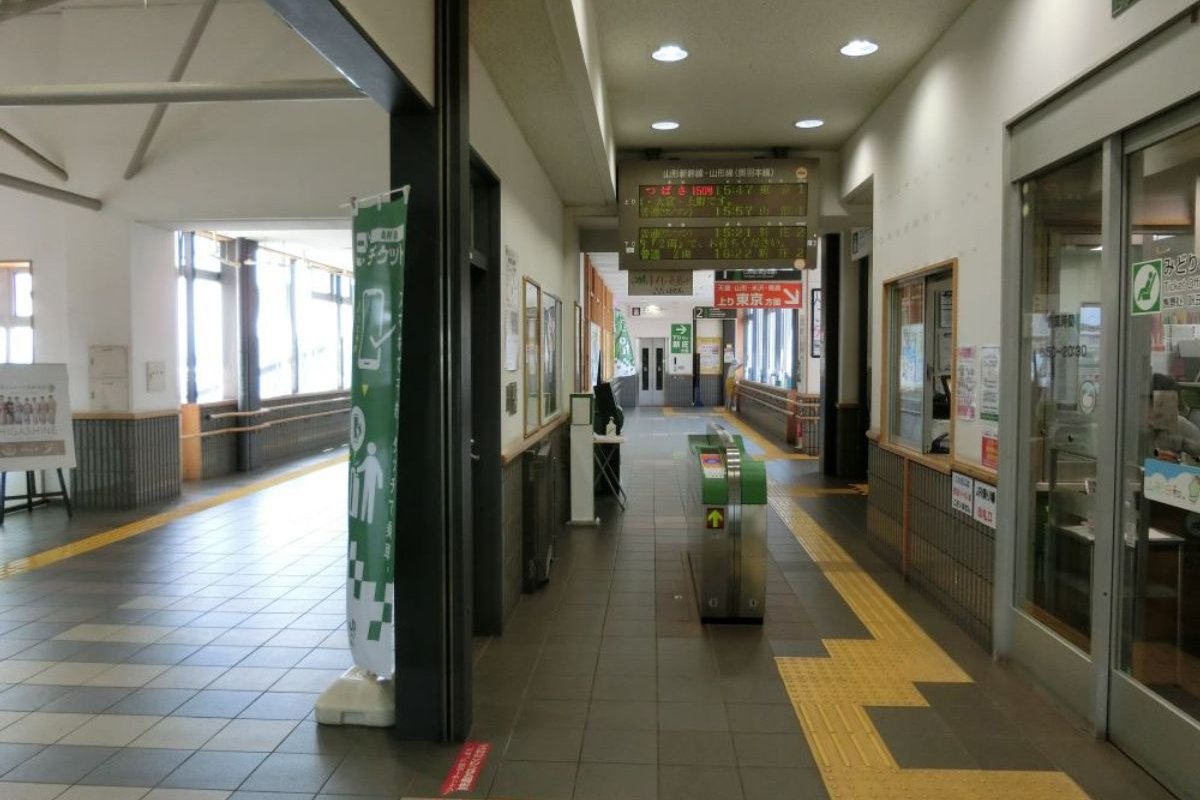 - 山形駅管理の業務委託駅(JR東日本東北総合サービスに委託)。みどりの窓口、自動券売機、指定席券売機、新幹線eチケットサービス用簡易Suica改札機、待合室が設けられている。以前はびゅう旅センターも設置されていた。直営駅時代は管理駅で神町駅と東根駅を管理下に置いていた。