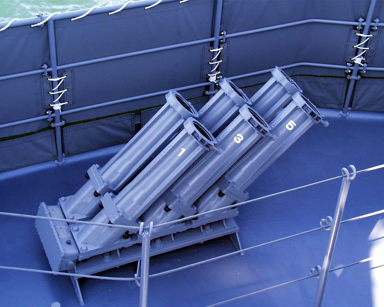対潜魚雷を3連装で発射します。アスロックに比べると、比較的近距離攻撃用となります。 対艦ミサイルを水際で撃墜するための、近接兵器です。