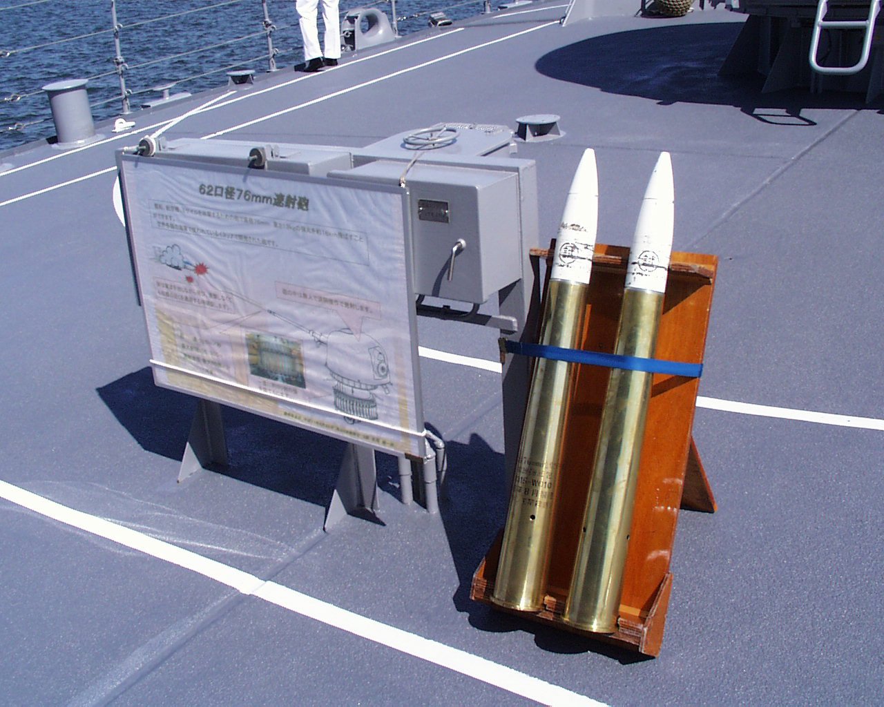 マスト前部に搭載しているのはOPS-14C対空捜索用レーダです。艦橋上部に搭載しているのは、FCS-2-21B射撃指揮装置です。マスト上部に搭載しているのは、OPS-28C対水上捜索用レーダです。 62口径76mm砲で使用する砲弾です。これを砲塔下部の艦内でマガジンに人力で装填する仕組みになっています。マガジンには80発を装填できるようになっています。実は80発は、本気で発射すれば1分で撃ち尽くす弾数です。