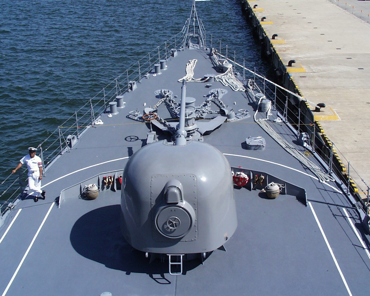 対空・対艦用艦砲です。砲塔内は無人ですが下部には砲弾を装填する人員が3名必要です。 アスロック対潜ミサイルの8連装発射機として艦中央部に設置されている。