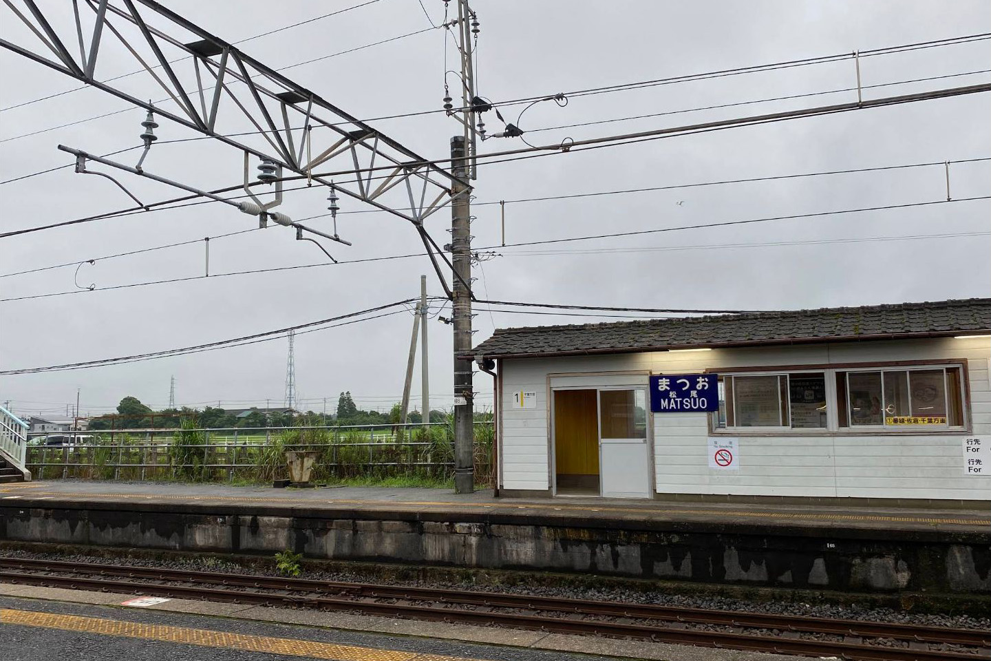 二つのホームは駅舎の横芝寄りにある跨線橋で結ばれている。1番線ホームには締め切り可能な待合所がある。