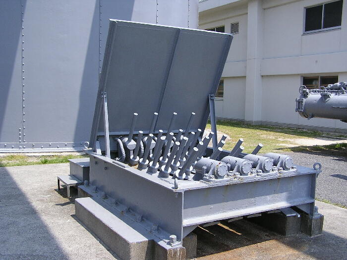 爆雷は、水上艦の場合、爆雷投下軌条、あるいは爆雷投射機によって水中に投下されます。海上自衛隊でも初期の護衛艦には搭載されていましたが、より効果が高く、射程の長いボフォース対潜ロケットやアスロックに取って代わられて、現在では水上艦艇では搭載されなくなりました。 |