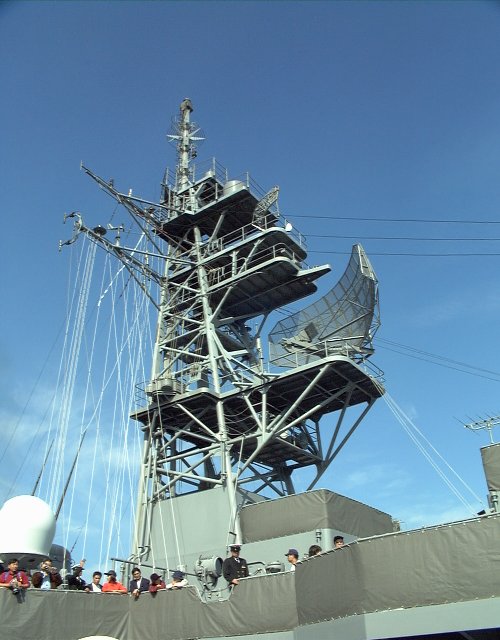 マスト中間にある大きなアンテナは、OPS-14対空レーダーで、その上のやや小さいアンテナがOPS-28対水上レーダーである。